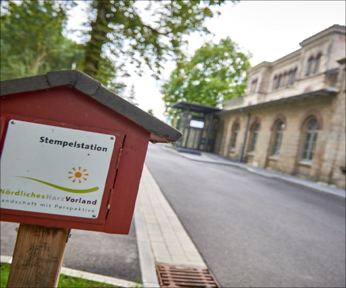 Die Stempelstation befindet sich auf dem Grundstück des Bahnhofsgebäudes (kleine Grünfläche an der Grundstücksgrenze), ca. 10 m südlich neben dem historischen Bauwerk.