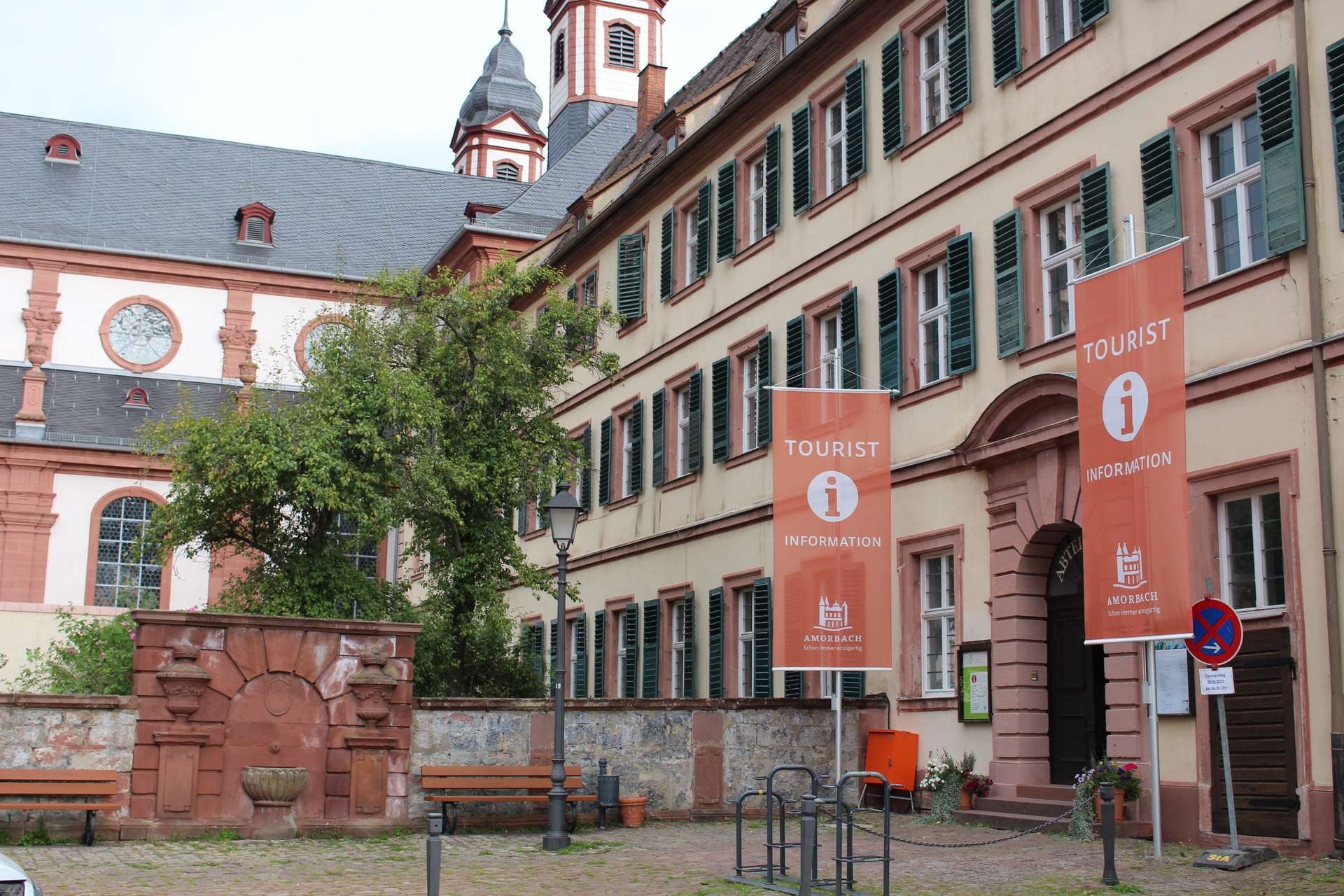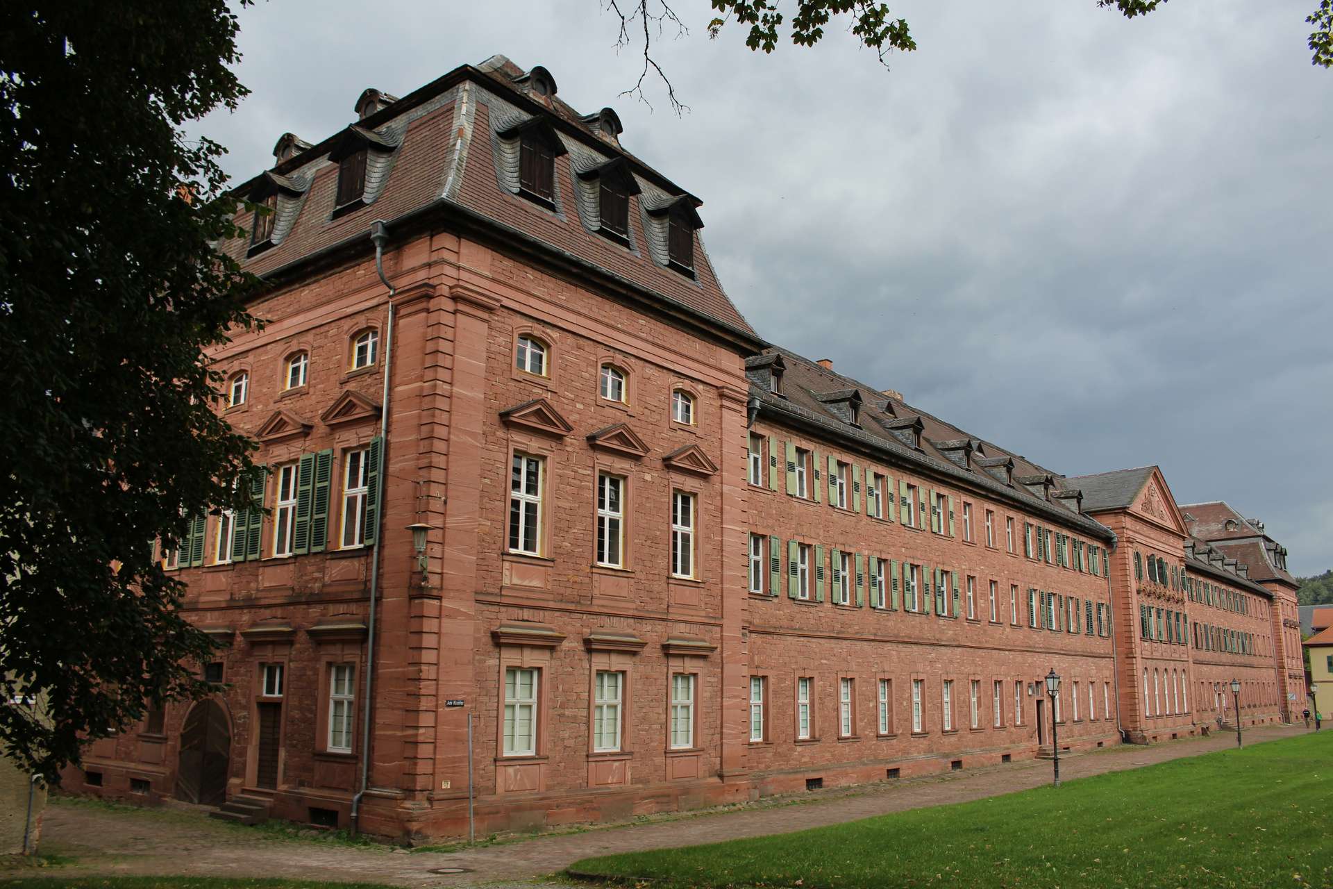 Nachdem in den Jahren 1742-1747 nach Plänen des letzten Abts des Benediktinerklosters, Benedikt Külsheimer, an der Stelle einer mittelalterlichen Kirche ein Neubau der Kirche im Stil des Barock entstanden war, entstand in den Jahren 1783 bis 1786 der Konventbau nach Plänen von Ignaz Neumann. Der Bau ist eine Verlängerung der alten Abtei und beherbergte neben den Wohnräumen der Mönche des Klosters das reich ausgestattete Refektorium, den Grünen Saal und die bemerkenswert gestaltete Bibliothek. Im Jahr 1803 gingen Abtei und Konventbau im Zuge der Säkularisation in den Besitz des Fürstenhaus zu Leiningen über. Heute befinden sich im Konventbau unter anderem die Touristinformation und Wohnräume.